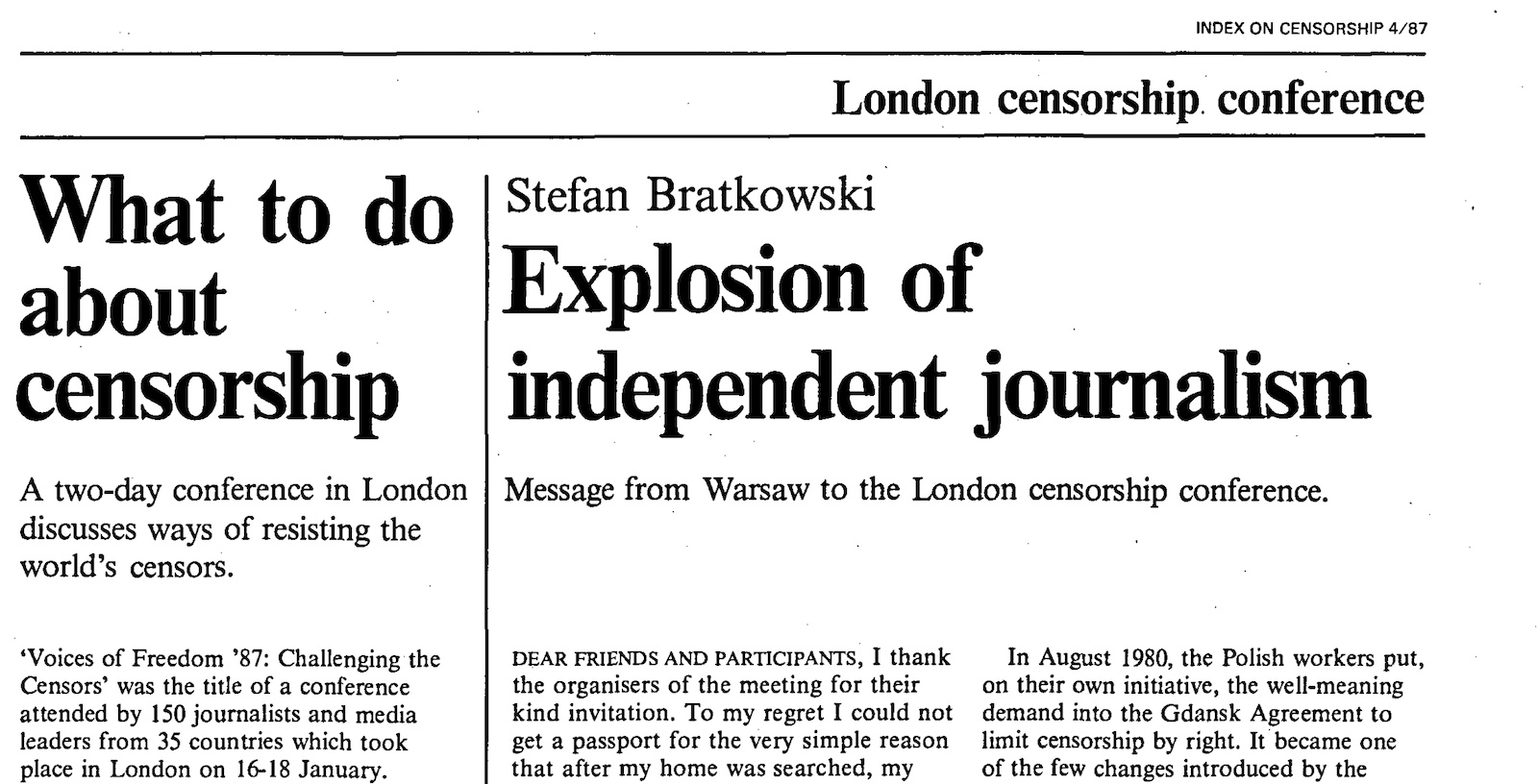 Among my audio tapes, I found Stefan Bratkowski’s Recorded Message to Participants of “Voices of Freedom ’87: Challenging the Censors” —a conference attended by 150 journalists and media leaders from 35 countries which took place in London on 16-18 January, 1987. The recording was transmitted from London to the Voice of America (VOA) in Washington where I worked since 1973.