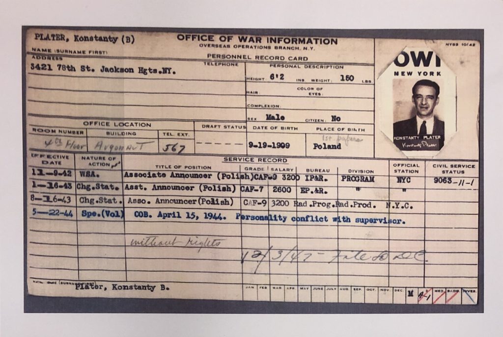Voice of America’s programs during World War II, when Konstanty Broel Plater worked there from late 1942 until April 1944, were quite different from Radio Free Europe’s and VOA’s broadcasts supporting freedom and democracy in the later years of the Cold War. During World War II, VOA operated under various names and functioned primarily as an anti-Nazi and anti-Japanese U.S. government propaganda radio station. Still, its pro-Soviet officials and journalists also turned it into a propaganda outlet on behalf of Stalin and supported in their broadcasts the Soviet takeover of East-Central Europe. VOA’s first chief news writer was Howard Fast, an American communist writer, and future 1953 Stalin Peace Prize winner. Fast was in charge of VOA English news when Broel Plater worked as a Polish-language announcer in the Overseas Branch of the Office of War Information. Fast’s patron, VOA’s first director John Houseman, who hired many Communists for VOA jobs, was quietly forced to resign by the Roosevelt administration, which was otherwise highly pro-Soviet and agreed to Stalin’s post-war domination over East-Central Europe. Some VOA Polish desk members and employees of other Office of War Information units specializing in producing propaganda targeting Poland and Polish speakers were radical socialists. Some later worked as anti-American propagandists for the regime imposed on Poland by the Soviets. In the late 1940s and the early 1950s, the Truman administration replaced them at the Voice of America with refugee journalists such as Zofia Korbońska. However, they still had to struggle with limited censorship by the VOA management of some of the reports of communist crimes and criticism of the Soviet Union until 1981, when President Ronald Reagan’s administration changed VOA’s leadership and eliminated such restrictions at the Voice of America.