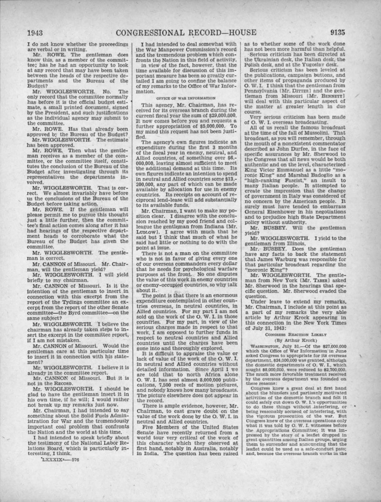 The labor federations AFL and CIO and members of Congress of both parties were still warning the Roosevelt administration at the end of 1943 about the subversive influence of communists within the Office of War Information and its radio broadcasting division. Several such warnings were made on the floor of the House of Representatives on November 4, 1943. Congressman Wigglesworth said that “material broadcast overseas by the O.W.I. at taxpayer’s expense has been sheer communism.” He revealed that some of the OWI employees already investigated and removed as a result of congressional inquires included “a former Vienna communist,…a former contributor to the Daily Worker and other communist front organizations, a Hungarian Communist, a German Communist.” He added that “a notorious Polish Communist” working for the OWI and “a Soviet agent who worked for the Soviet[s] in the Baltic’s, said to have forged press credentials,” have not yet been investigated.32